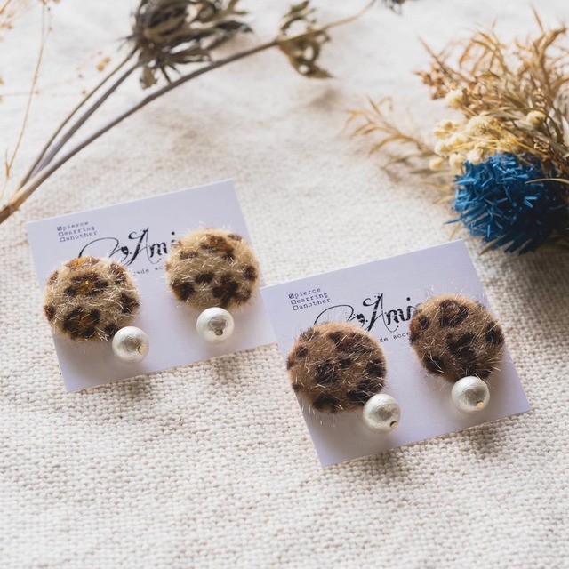 ご覧いただき、ありがとうございます! レオパードとコットンパールの組み合わせが大人かわいいイヤリングとピアスです♡ カジュアルな印象のレオパードですが、コットンパールを合わせることで上品に仕上げました ◡̈*♬ シンプルコーデのアクセントにもピッタリ! カラー:《ベージュ》《ブラウン》 ※着用イメージは衛生面を考慮してパネルに装着したものを撮影しております。 ▣サイズ 約縦 4cm × 横 3cm ▣購入の際の注意点 こちらはイヤリングかピアスをお選びいただけます。 ご購入の際はお間違えないようご注意ください。 金属アレルギーの方はご利用をお控えください。 ハンドメイドのため、既製品よりもデリケートに出来ています。装着は丁寧に行なってください。