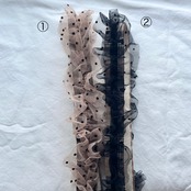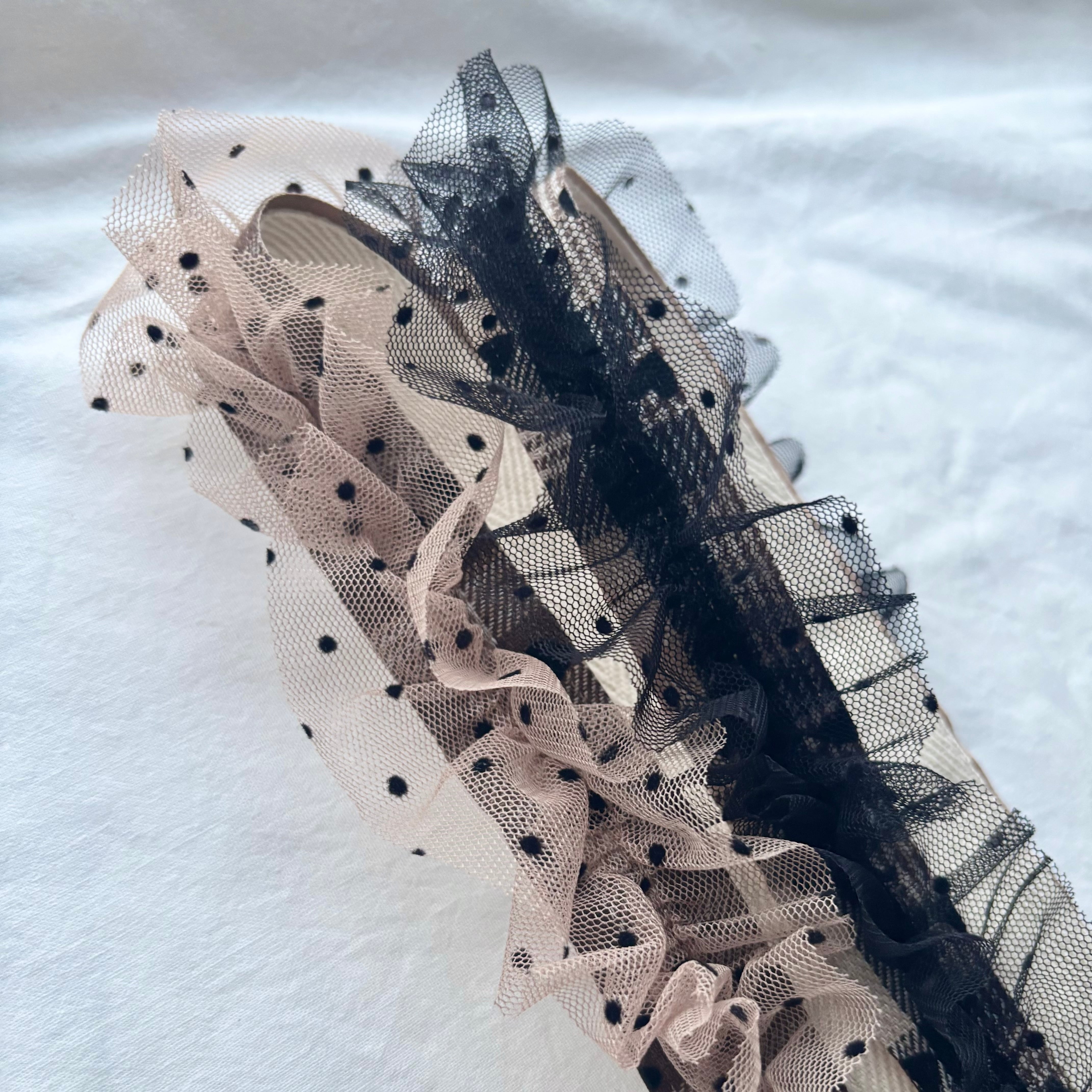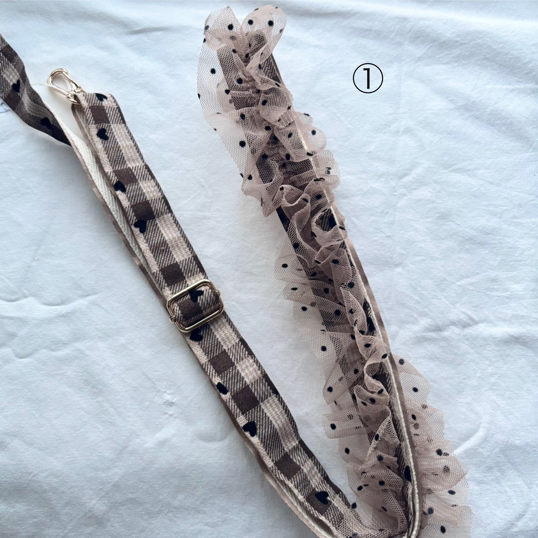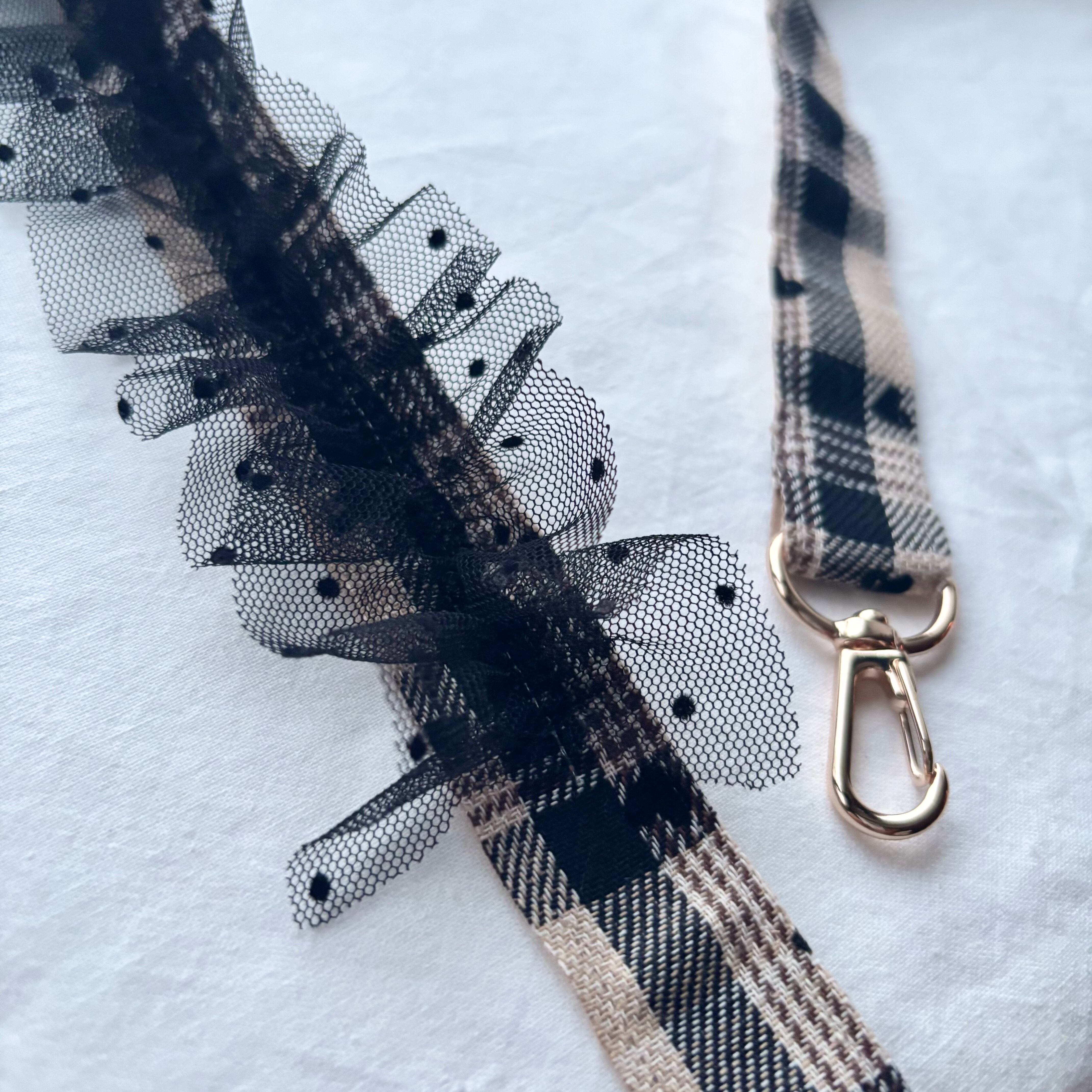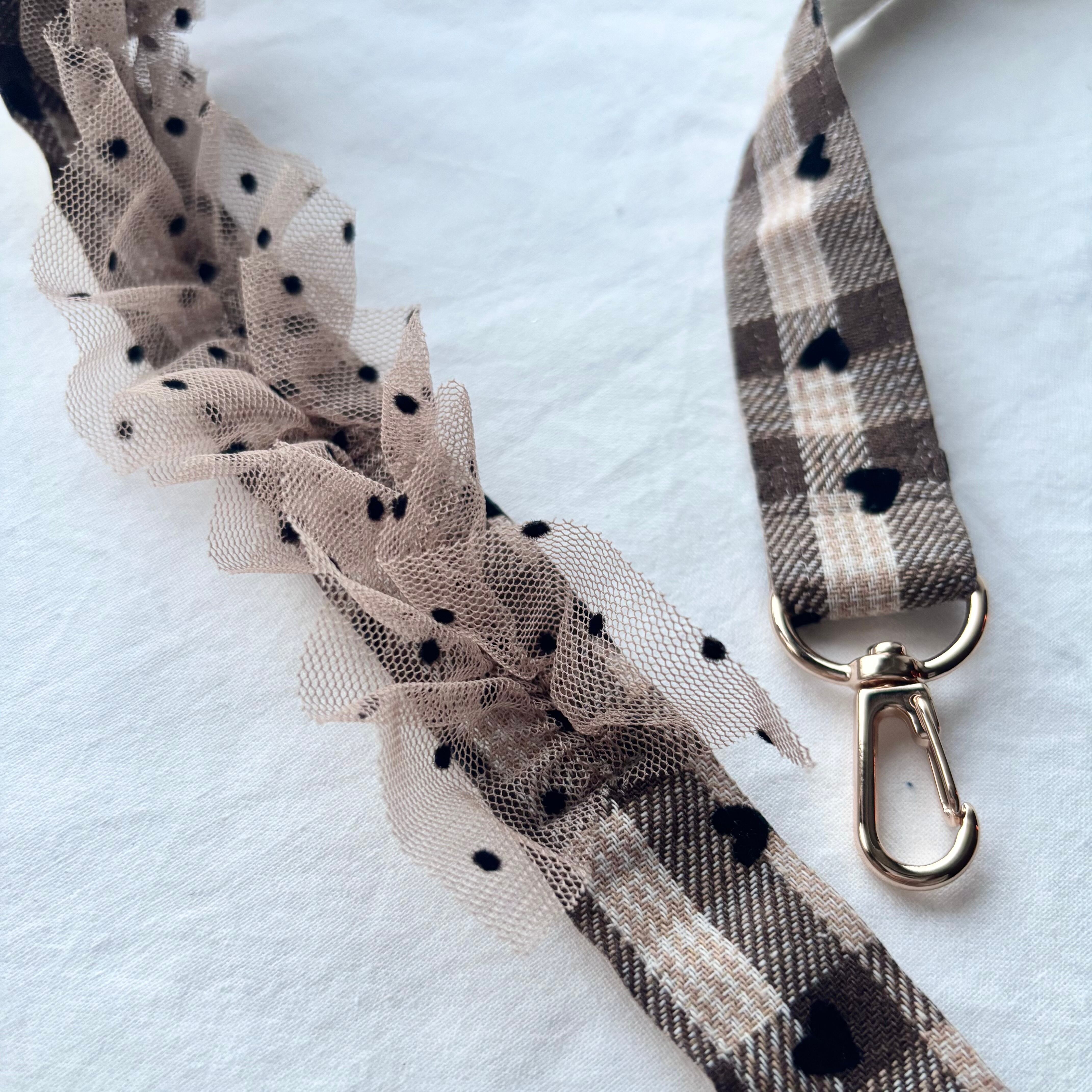 ハートのフロッキー加工が入ったチェック柄のショルダーにドットのチュールフリルを重ねたスマホショルダーストラップ♡