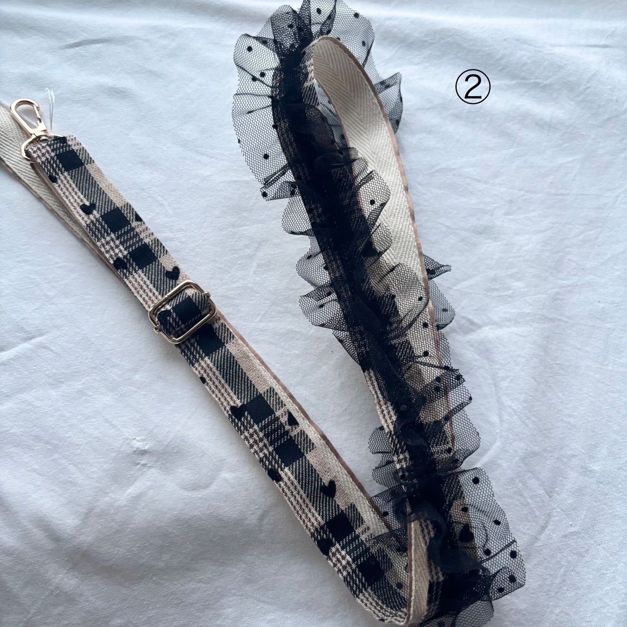デイリー使いしやすいボリューム控えめのチュールフリル×チェック柄のストラップはカジュアルからキレイめスタイルまで幅広く合わせやすいデザインです!