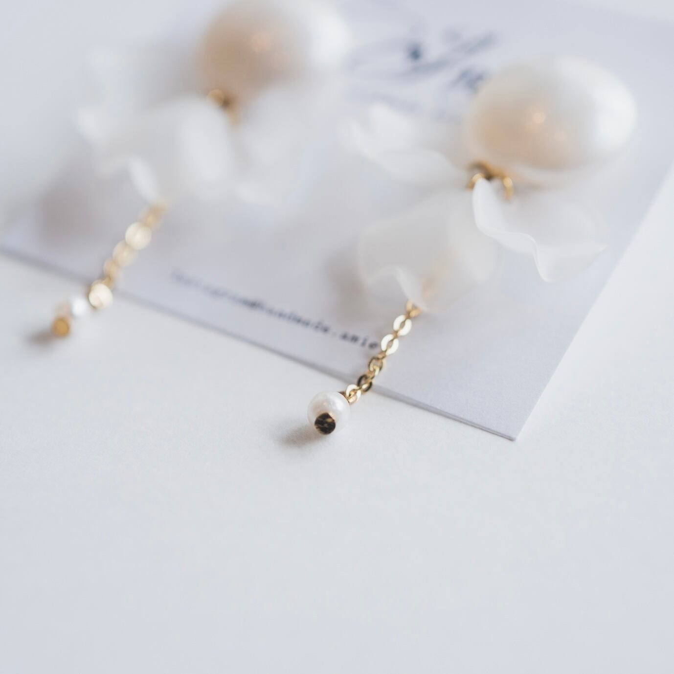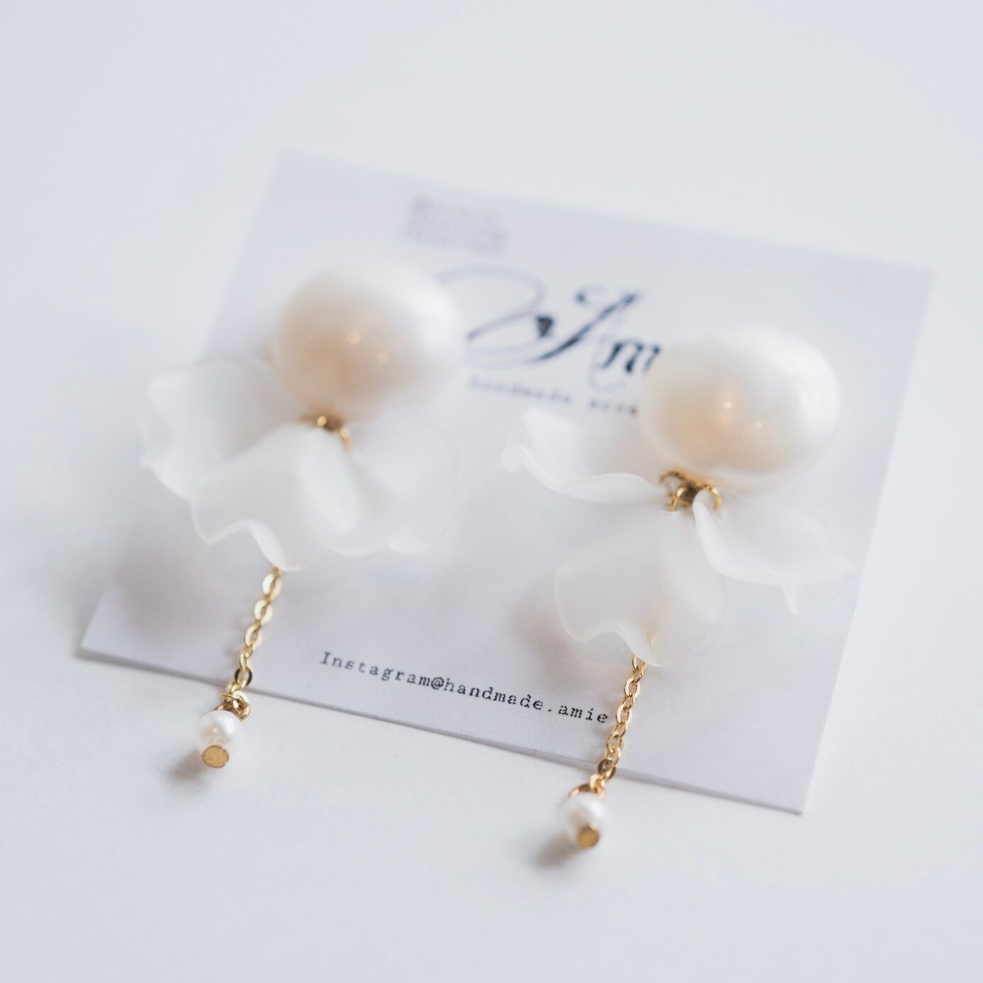 すりガラスのような花びらとパールがゆらゆらと揺れてかわいいピアスです♡