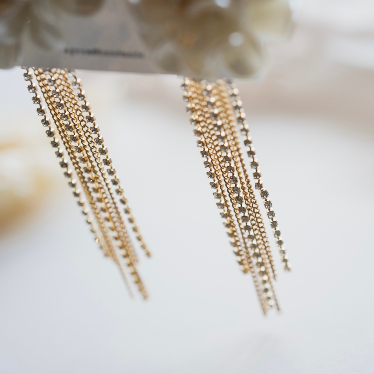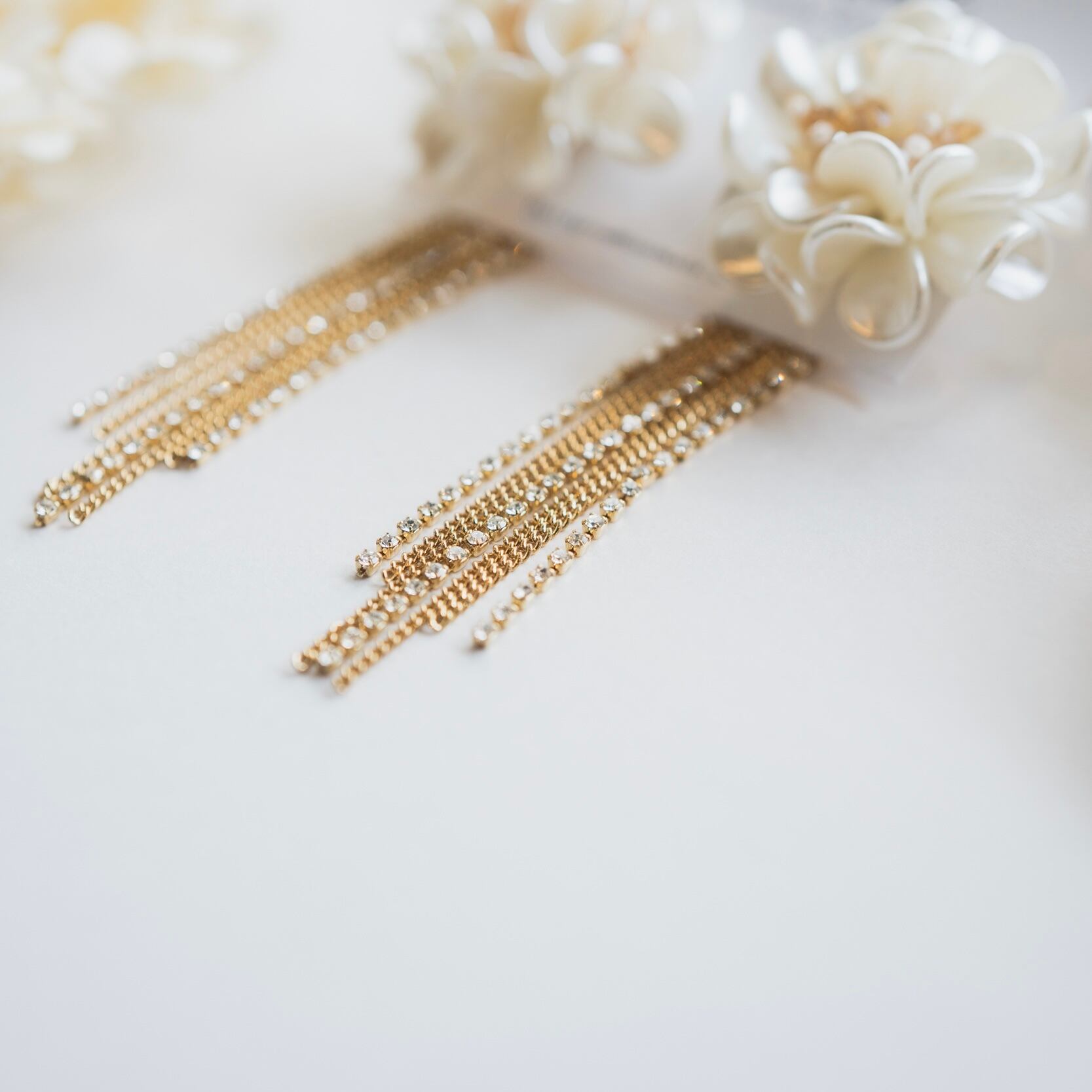 キラキラのビジューのチェーンがゴージャスな印象を与えてくれるので、結婚式などのパーティシーンでもお顔周りを華やかに演出してくれます!