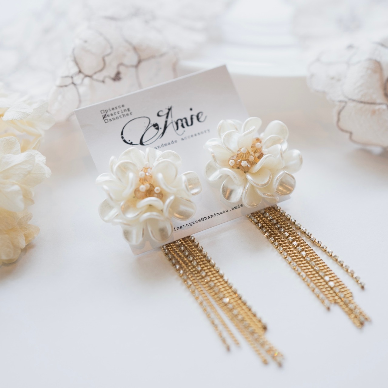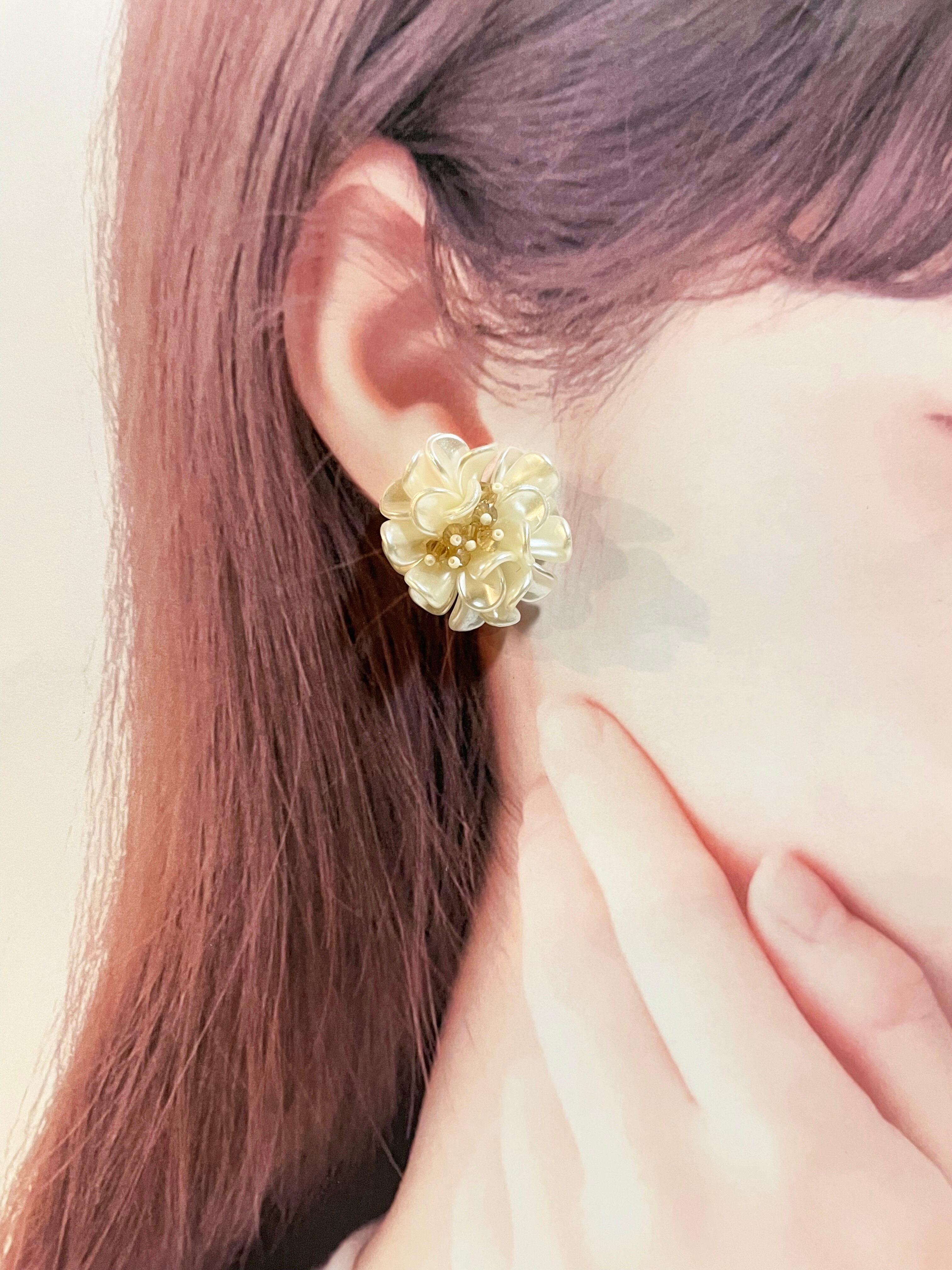 パールの花びらをいくつも重ねてできた大ぶりなお花のイヤリングです❁