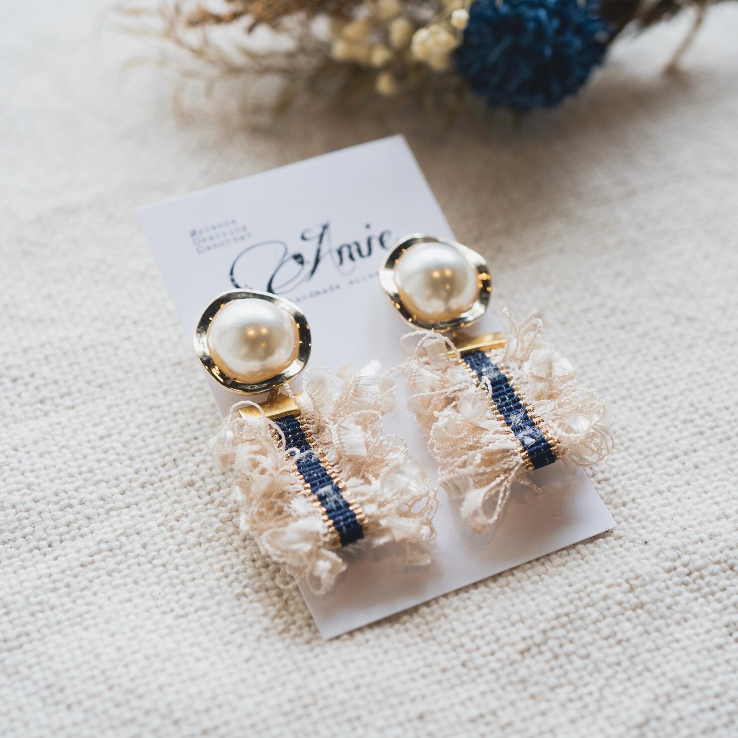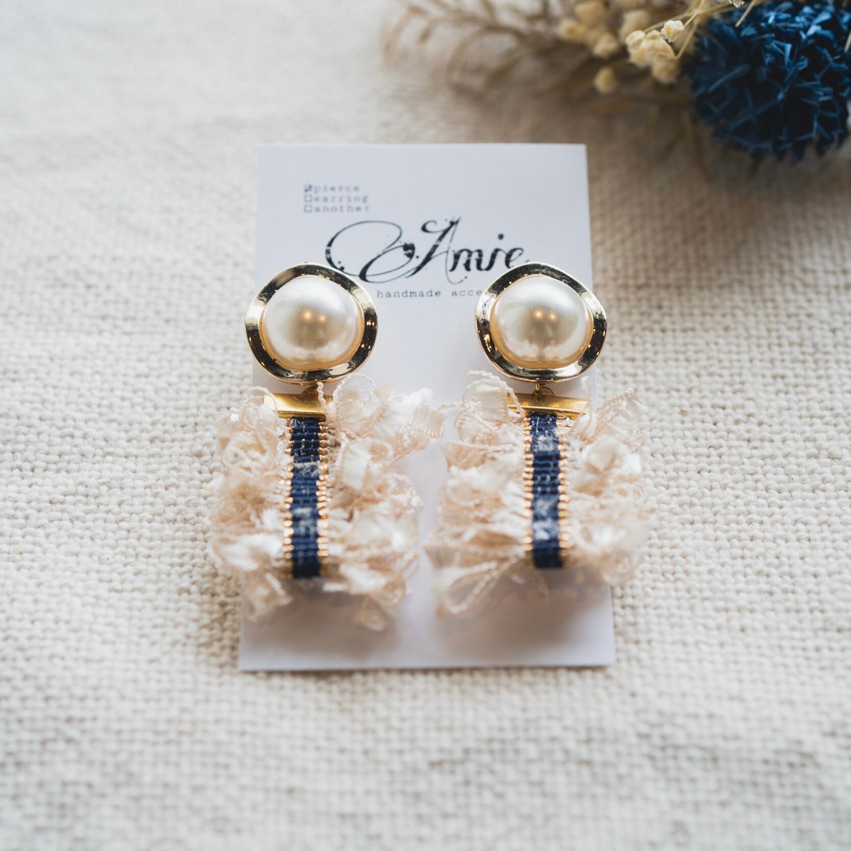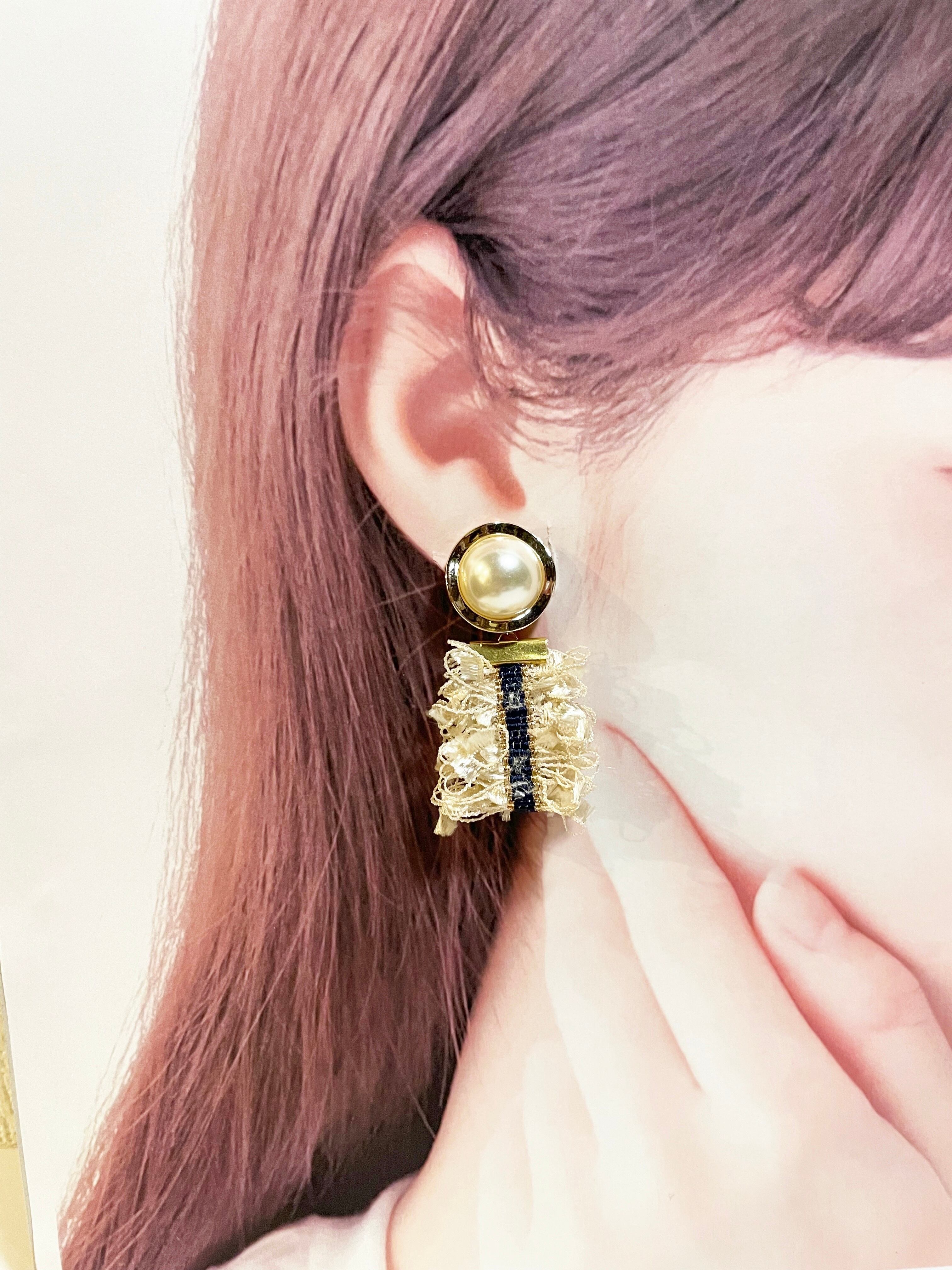 ゴールドとデニムのラインがポイントのフリンジリボンを使ったオシャレなピアスです ◡̈*♬