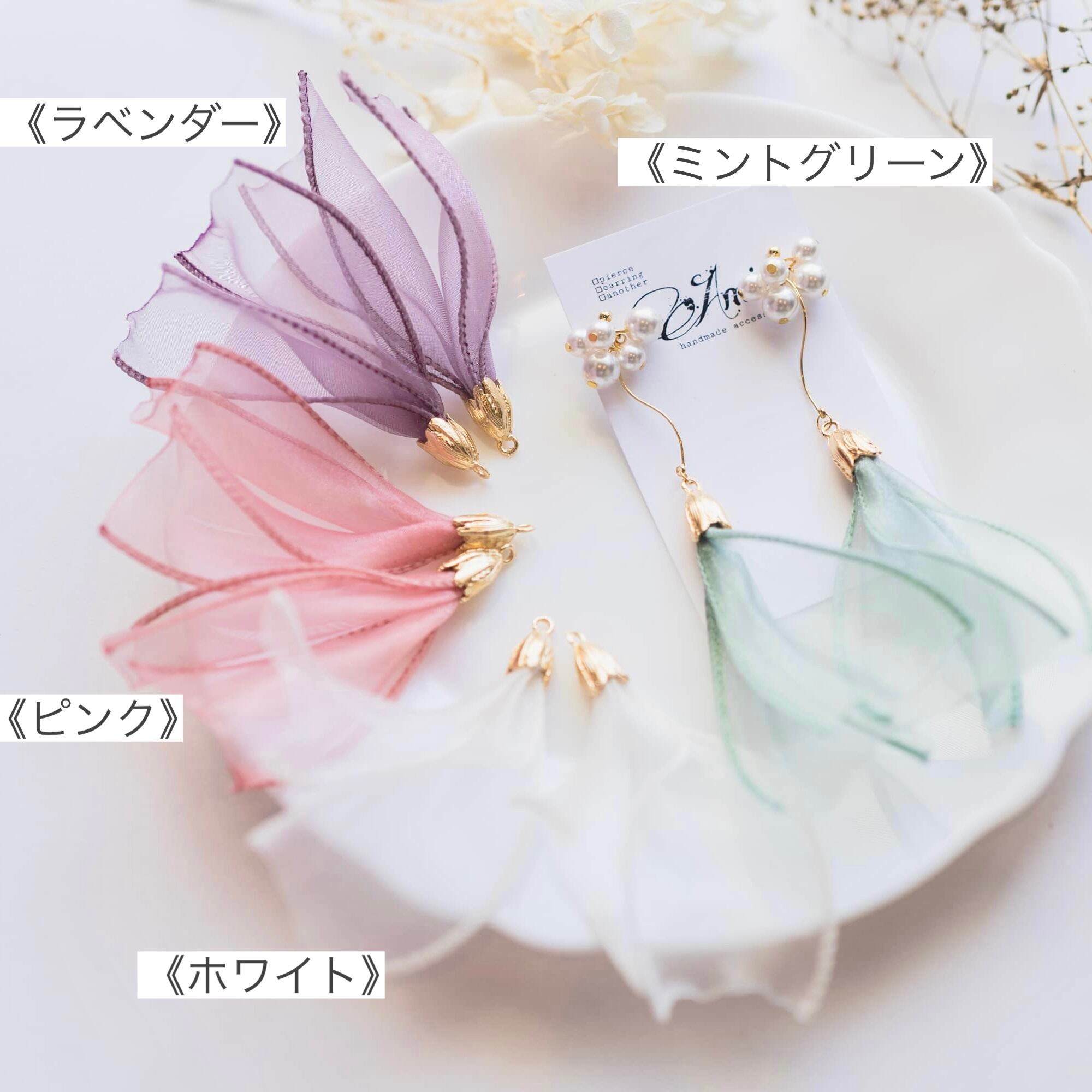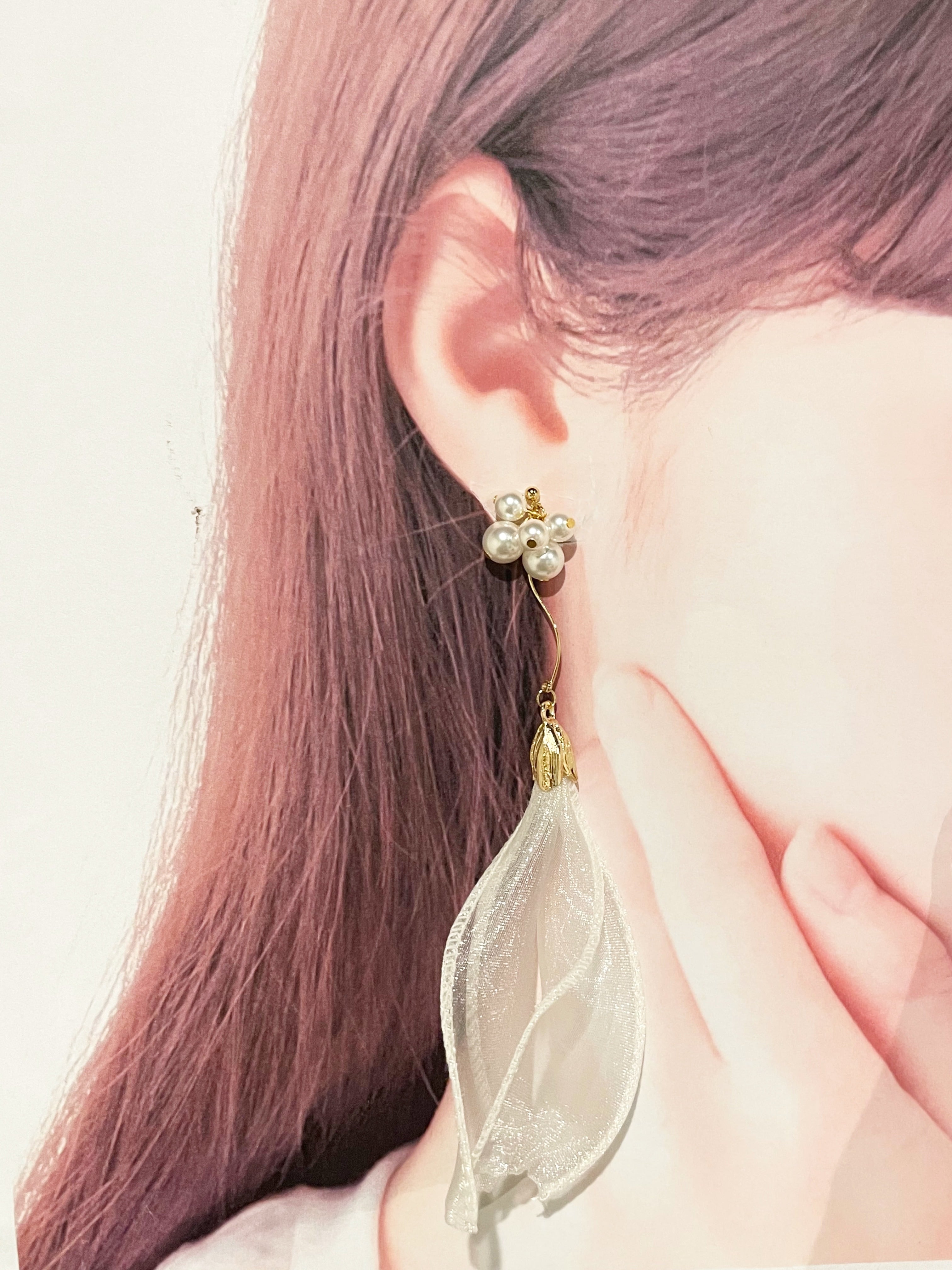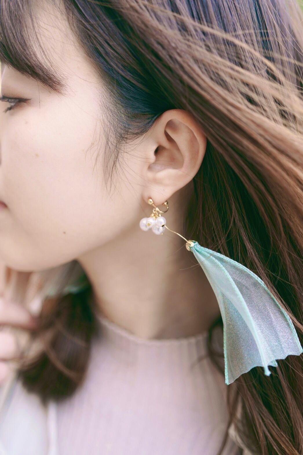 風になびくオーガンジーリボンが存在感抜群のイヤリングとピアスです!