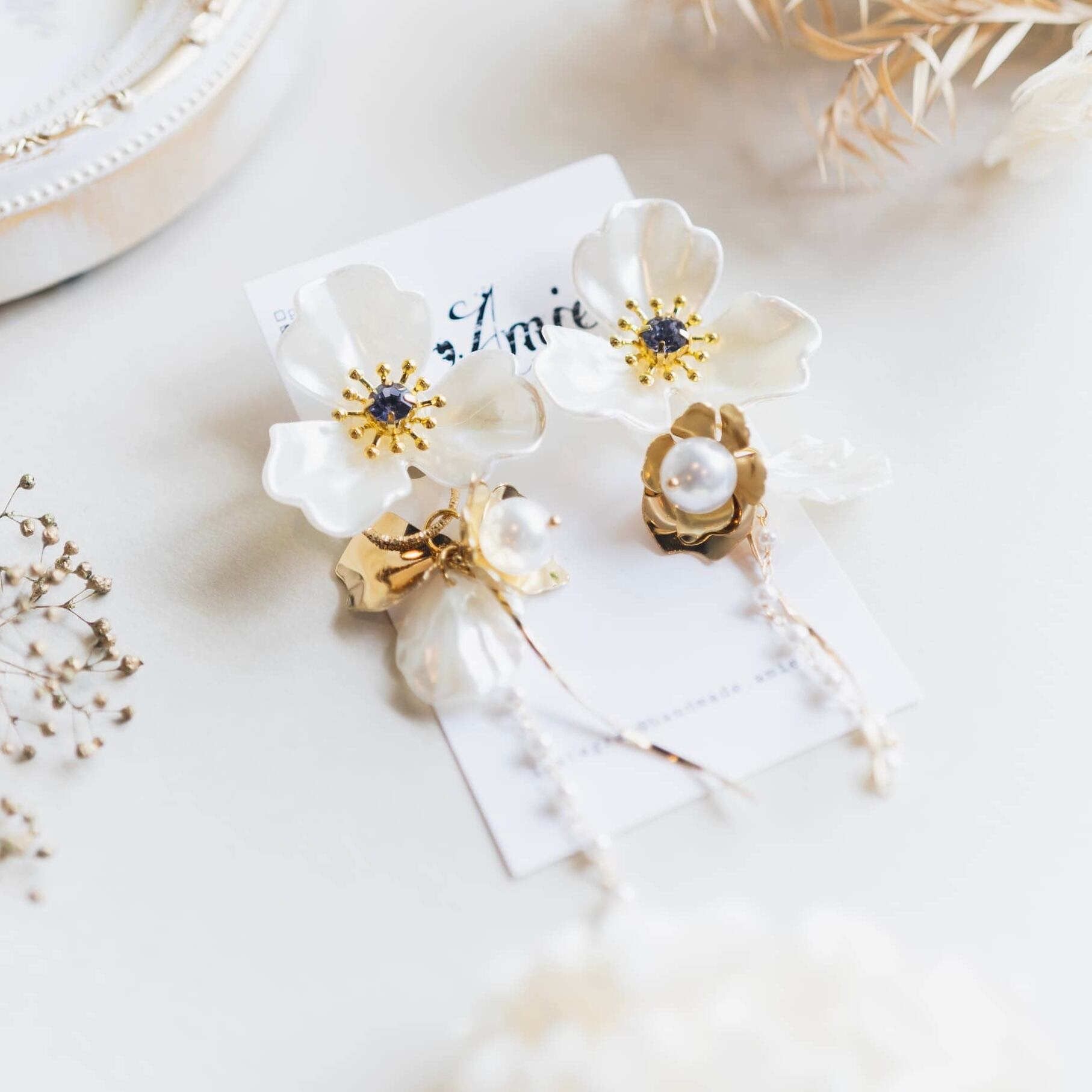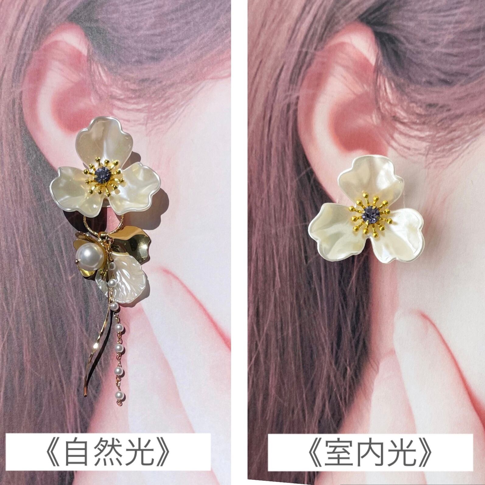大ぶりなパールフラワーからゆらゆらと揺れるチャームが存在感のあるイヤリングとピアスです ◡̈*♬